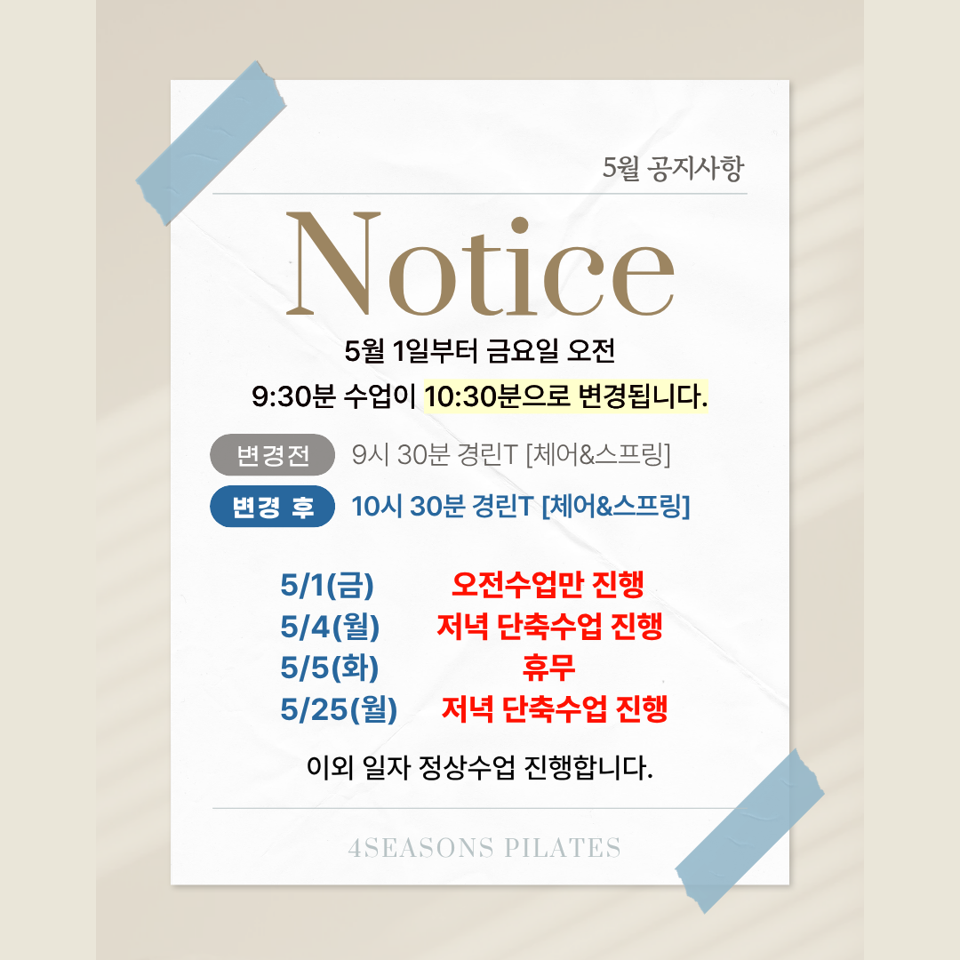 5월 1일부터 금요일 오전 [9시 30분] 수업이 [10시 30분]으로 변경됩니다.